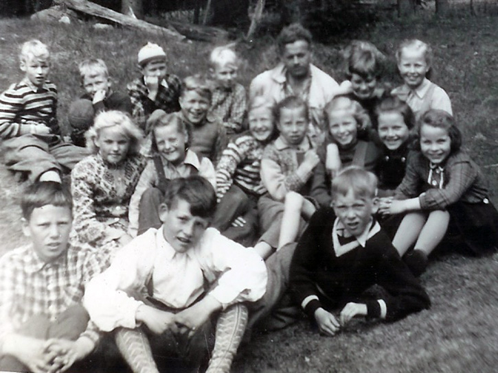 Jon Tørå med elever fra Moen skole på tur til Knølen. Bak fra venstre: Hallvard Engebretsen, Einar Flaatin, Hans Arne Flathus, Johnny Steinstad, Hallvard Andersen, Jon Tørå, Liv Innleggen, Karen Margrethe Hauen